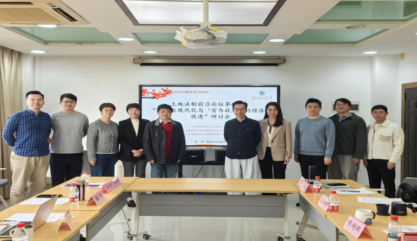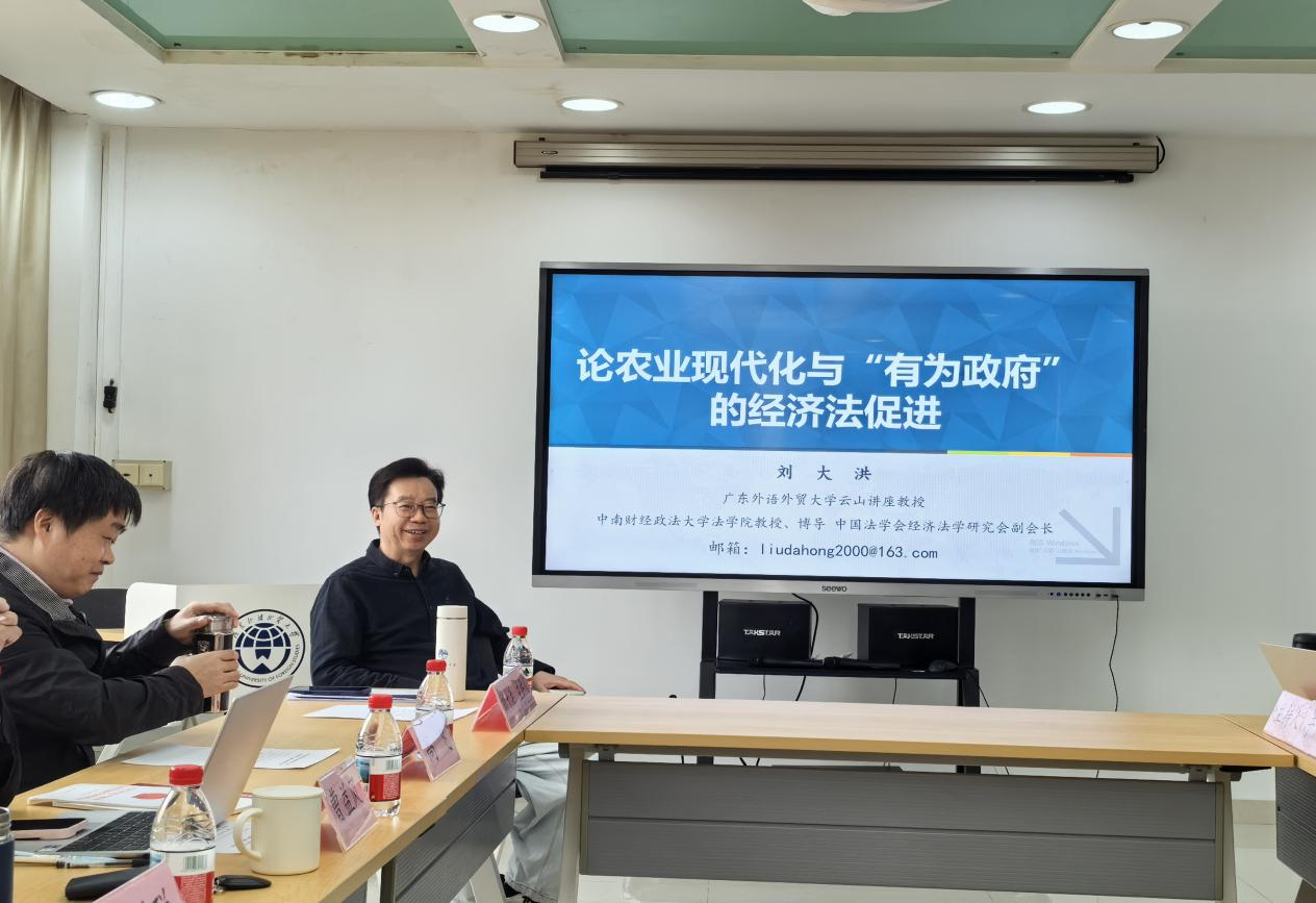 2025年11月28日,由广东外语外贸大学土地法制研究院、“民法典时代土地治理体系公私法协同机制研究”广外科研创新能力提升专项计划研究团队共同举办的校庆60周年系列活动“土地法制前沿论坛”第41期“论土地现代化与‘有为政府'的经济法促进”研讨会,在北校区第八教学楼612会议室成功举办。本次研讨会邀请中国法学会经济法学研究会副会长、广外云山讲座教授、中南财经政法大学法学院刘大洪教授担任主讲人。广外土地法制研究院院长高飞教授、副院长张凇纶教授、于凤瑞教授,专职研究人员曹益凤博士、孙聪聪博士、陈越鹏博士、杨远舟博士、吴昊博士、周崇聪博士以及部分博士生共同参与研讨。会议由于凤瑞教授主持。