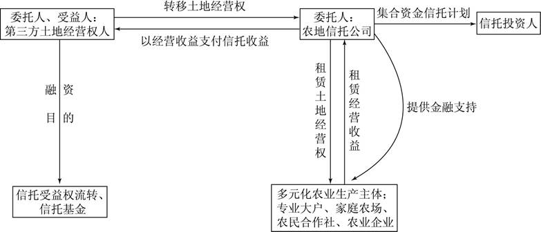 在土地经营权信托法律关系中,农地信托公司不仅能够在“财产权信托”中发挥受托人的经营管理职能,还具备在“资金信托”中紧密连接资本市场,为相关主体提供金融支持的功能,从而形成“财产权信托”与“资金信托”平行推进的“双信托结构”。具体来讲,信托资金计划分成两步进行:第一步,推进农村土地经营权的“财产权信托”,形成委托人、受托人、受益人三方当事人的信托法律关系;第二步,根据项目运转、资金需求等实际情况,农地信托公司适时择机发行集合资金信托计划,吸引广泛的社会资本投资,为土地利用提供融资支持,用于流转土地区域内的土地整理、农业设施建设,以及为农业生产主体提供贷款以便农业生产经营活动顺利开展。同时,由于农地信托公司具有专业的资产管理能力,能够帮助委托人创造财产收益,故土地经营权信托业务还可以衍生出现金资产托管业务,将土地经营权人未来得到的信托收益作为信托基金,委托农地信托公司管理运作,从而产生更多的资本收益。