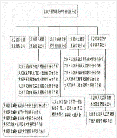 北京市是目前试点城市中唯一利用集体土地建设共有产权住房的城市,在这以前已积累了丰富的集体经营性建设用地入市经验,本次建设共有产权住房是在原有基础上的新突破。总体来讲,“北京市集体经营性建设用地入市主要采取以乡/镇政府为主导的供地模式,在现有集体建设用地的基础上打破村的界限,将多个村的集体经营性建设用地通过土地空间置换,增减挂钩等方式归并流转。”此次大兴区沿用这种做法,用于建设共有产权住房的三宗集体土地属瀛海镇西一村和西二村所有,土地实际出让人为北京汇瀛恒业有限公司,三宗土地使用权首先转让给北京兴福集地资产管理有限公司,该公司是由村、镇、区三级联合成立的区级土地联营公司(见图3),主要负责拆迁和腾退,待符合三通一平条件后,再将土地使用权挂牌出让。