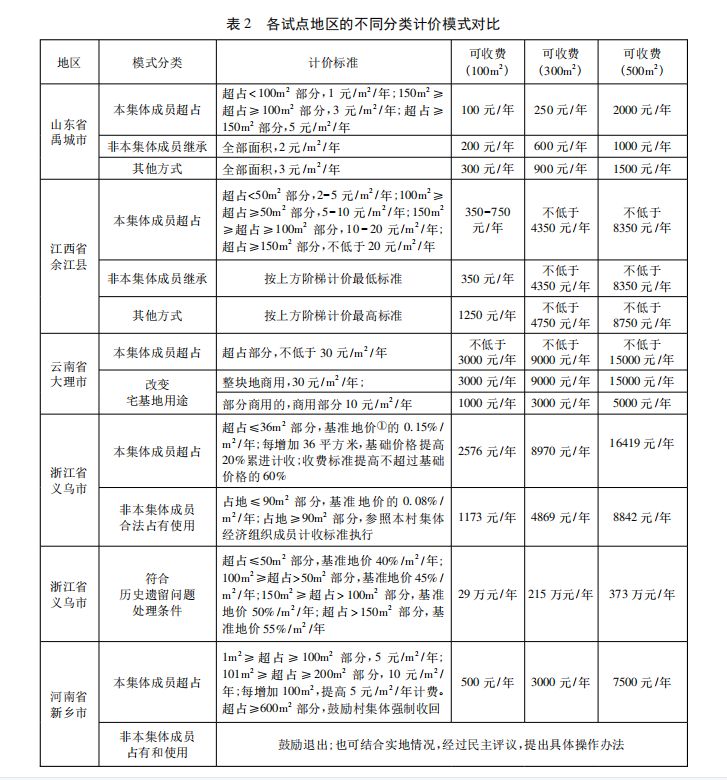 2.收费标准,收费标准的确立应是宅基地有偿使用制度运行的核心。为了更加直观地对比不同地区对于不同类型宅基地的不同层次计价标准,选取位于不同省份的山东省威海市、江西省余江市、云南省大理市、浙江省义乌市以及河南省新乡市五处试点地区作为对比对象,分别对比其在不同宅基地有偿使用类型下的收费标准,以及可收费面积为100、300、500平方米情况下的有偿使用费收取情况。