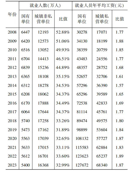 从2008—2023年我国城镇就业基本情况的统计数据可以看出,虽然国有单位就业人数呈现下降趋势,但是2023年仍然保持着5400万人的庞大规模,占城镇非私营单位就业人数的32.99%(见表1)。相较于体制外单位,进入体制内单位工作是众多求职者梦寐以求的选择,这主要是由于在体制内单位取得编制的员工享有诸多优待,如工作稳定、福利优厚(如良好的工资待遇、五险一金与年终奖励等)且社会地位高。