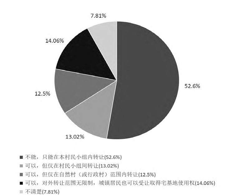 通过村干部访谈得知,多数受访地区的农房及宅基地仅能在村(小组)内部转让,且对受让人有限制。问卷调查显示,78.65%受访村民认为农房及宅基地转让应当有范围限制,其中52.6%受访村民认为农房及宅基地仅能在村民小组内部转让(见图2)。然而,未经村集体同意的农房对外隐形交易仍然存在于农村实践。