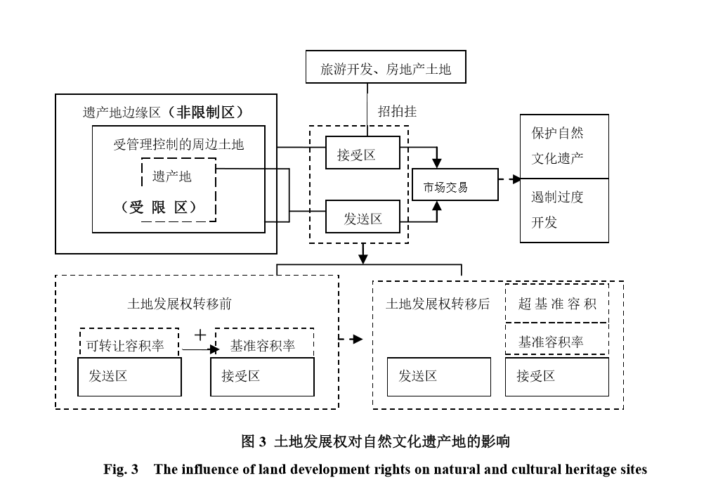 土地发展权的制度设计体现的是一种利益衡平理念,为市场经济体制下调和遗产保护与市场逐利间的矛盾,遏制遗产地过度开发提供了解决路径。土地发展权机制通过界定自然文化遗产地土地性质,明确土地增值收益分配机制,推行遗产地土地使用管制和土地发展权市场交易机制,将市场的自发调节与政府的强制管理有机结合。基于遗产地保护和发展目标,借鉴国外的“发展权转移”(TDR),将自然文化遗产地以及周边的受限区划为发送区,将遗产地边缘区(非限制区)划为接受区,经程序对发送区、接受区的容积率进行量化、限定,并允许发送区的容积率向接受区转让。借助市场的公平竞争机制,“接受区旅游开发商按开发强度购买超基准容积率,发送区以容积率流转实现土地发展权价值”,以此分摊自然文化遗产的保护成本,降低保护压力;通过受限区与非受限区容积率的量化、限定和转移,保证农民的合理补偿减少农地流转,限制开发程度,遏制过度开发(图3)。