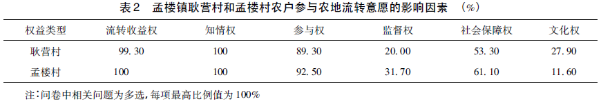 3.地方政府以“经济权益”实现为主的农地流转工作理念与农民非经济权益意识觉醒存在冲突。在农地流转中,农民非经济权益意识逐步觉醒,其权益诉求包括不因农地流转而降低生活水平、及时就业、有稳定的收入来源、拥有基本社会保障、合理分配土地流转收益、农地流转收益及时发放、流转后农地合理利用等方面。对农户农地流转意愿的调研表明,农地流转收益权、知情权、参与权和社会保障权是影响农户进行土地流转决策的主要因素(见表2),而监督权、文化权的影响较小,耿营村占比分别为20%、27.9%,孟楼村占比则分别为31.7%、11.6%。虽然关注监督权、文化权的人数占比不高,但足以表明土地流转中仅实现农民经济权益,并不能满足农民实际权益诉求。