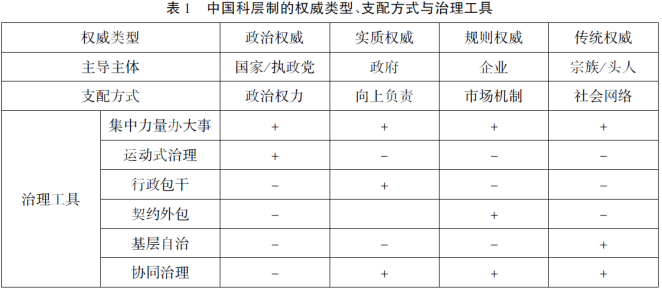 而集中力量办大事恰恰将上述分析概念整合起来,形成了中国官僚组织效率的总体性分析框架,即通过不同类型的权威及其支配方式的单独或区别性组合,建构不同的治理工具,从而完成相应的治理任务(表1)。其中,运动式治理主要通过政治权威来推动。不论是基于克里斯玛的使命感,执政党借助国家力量来改造社会,还是官僚机构的常规治理难以有效回应国家治理的多样性及其规模负累,运动式治理都是不二选择,而支撑起运转的则是基于克里斯玛化的政治组织及其权威。行政包干制则强化了权力与责任统一性。契约外包基于法理权威执行合同关系,通过政府购买、民营化等方式,运用市场机制的优势来提高公共服务品质;基层自治主要依赖于地方性规则和社会网络,运用情感渗透的方式来维持秩序;协同治理则来自于政府、市场和社会等主体的通力合作。
