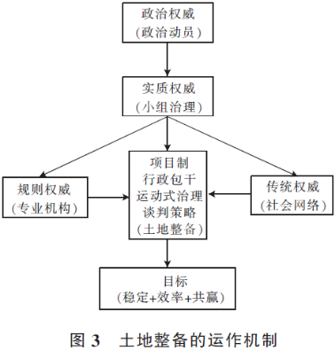 总的来讲,G区政府在土地整备工作中,有效地整合了各种权威,通过分类谈判的方式有效地化解了被搬迁人的对抗情绪与行为,并最终实现按期签约的目标。据统计,2019年,G区全年完成土地入库超10平方公里,占全市年度土地入库总量的63%,全年完成5片较大面积产业空间入库达6.69平方公里,占全市年度较大面积产业空间入库总量的80%;土地整备成效连续四年第一。通过对土地整备的分析,不难发现,地方政府集中力量办大事整合了政治权威、实质权威、规则权威与传统权威,将政治、行政、市场与社会的力量集中于工作小组,借助项目制、包干制、服务外包、运动式治理等治理工具,并基于不同的权威基础采取相应的谈判策略,最终实现了土地整备的稳定、效率与共赢目标(图3)。