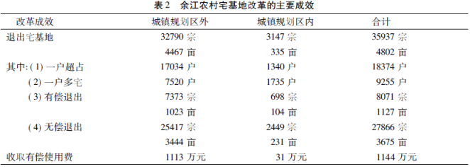 调查表明,一方面余江农村宅基地利用效率低下,大量闲置,浪费严重,另一方面,争占宅基地现象与日俱增,矛盾尖锐,乱象丛生。作为全国首批农村土地制度改革33个试点地区之一,2015年,余江正式启动农村宅基地制度改革并取得重要突破(表2):第一,余江区分五个批次,在全区1040个自然村全面推进农村宅基地制度改革,改革涵盖整个区域范围;第二,至2018年底,余江全区自愿退出宅基地34161宗、4802亩,退出土地可以满足全区未来15年内农村新增人口建房的用地需求;第三,余江区通过全面推进农村宅基地制度改革收取了农村宅基地有偿使用费1144万元,由集体经济组织支付退地补偿费1974万元。