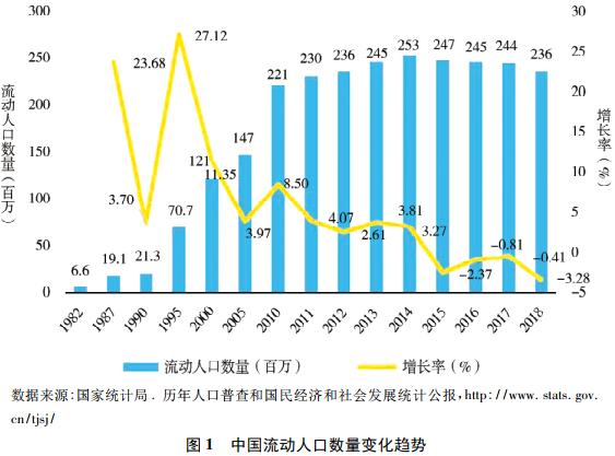 1.流动人口规模庞大。在区域经济布局呈现进一步集聚的大背景下,流动人口呈现出庞大的规模和较高的增速。根据历年人口普查和国民经济和社会发展统计公报,2014年之前,流动人口增长速度较快,从1982年的660万人增长至2014年的峰值2.53亿人,随后略有下降,但规模一直较大。2019年,全国流动人口为2.36亿人,占总人口的比重为16.86%。农民工作为中国流动人口的重要组成部分,其规模也稳定上升,增速放缓。但要看到,农民工数量增速放缓一方面是因为历史上农村人口出生率有所下降,另一方面是因为近年来优势地区面临政策约束,导致经济增速和劳动力需求增速下降。即使如此,2019年,全国农民工总量为2.9亿人,其中外出农民工占比60%。在外出农民工中,又以省内就业为主,占比56.9%,规模持续增长。