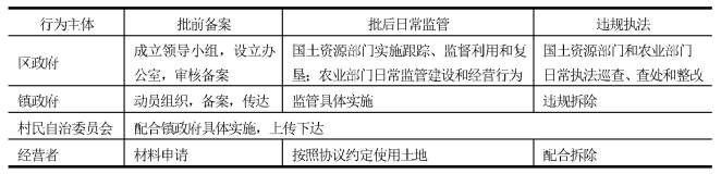 纵向责任链条主要是指责任在科层制内的传递链条。它以政策文件为链接点,以政策行为为载体。通过政策文件,各级政府以书面规定形式建立起各自的责任边界及其链接关系,奠定责任履行的框架。通过政策行为,各级政府及其部门将书面责任转化为具体行为责任,形成责任履行的关键。这两个环节相辅相成,共同推动政策有效落地。基于科层制特点,设施农业政策在优成农场的落地过程形成了“批前备案—批后日常监管—违规执法”的完整书面责任链条和政策行为分工体系(见表1)。为了推动责任由书面规定向政策行为的转化,区政府明确了属地管理、部门监管的原则,并将设施农用地使用和管理纳入镇级政府年度耕地保护责任目标进行考核。事实上,在批前备案环节,各个主体分工合作,责任履行状况良好,推动了前期政策的顺利落地。在批后监管环节,纵向责任出现了书面规定与政策行为之间的异化,形成了责任消解现象。这典型体现为各级政府和村民自治委员会在政策监管有效性上有所懈怠,政府部门本着“材料为准”的原则进行备案程序,经营者在履行合法手续的掩盖下经营农家乐,两方似乎都基于“不出事”这一底线而相安无事。实际上,这种异化现象在政策执行领域较为普遍,也往往构成了政策异化的主因。例如,秦岭事件中,陕西省和西安市的上有政策下有对策、层层空转做法为秦岭违建别墅整而未治、禁而不绝埋下了隐患。在“大棚房”整治阶段,上级政府采用“卫片”、“疑似图斑清单”等硬性技术工具来推动“逐宗摸排清查”,表面上是监管强度的升级,实际上是对政府责任履行不到位的强力纠正。