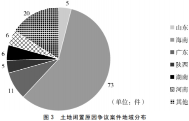 图2显示土地闲置原因争议的行政诉讼案件数量整体呈逐年递增趋势,图3则显示闲置土地案件主要集中于海南省。结合图2可以对图3作出以下合理解释:2012年《闲置土地处置办法》(以下简称《办法》)修改以后,全国各地加强对房地产市场的宏观调控,各级国土资源主管部门对积压的闲置土地进行集中整治,案例数量增加也就在情理之中。具体到海南省,2016—2019年正值海南房地产市场逐步从20世纪90年代初形成的泡沫中复苏。一方面,这可能与2015年集中出台《海南省人民政府关于进一步做好闲置土地处置工作的通知》(琼府[2015]24号)和《海南省人民政府办公厅关于加快闲置土地处置工作的通知》(琼府办[2015]204号)有关;另一方面,更可能是分税制改革下的“土地财政”现实驱动了各级国土资源主管部门收回闲置国有建设用地使用权,由此也引发了更多的行政争议,特别是土地闲置“政府原因”的判断。