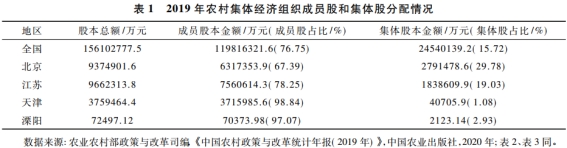 股权设置和管理是推进股份合作制改革的重点内容,也是乡村治理的重要体现。股权管理方式决定了股份权能的实现路径。关于是否设立集体股,各地主张不一,而中央对于集体股的取舍及比例也没有明确标准,导致各地改革操作差异较大。从表1可以看出,全国集体股占总股数的15.72%,但是有的地区相对较高,比如北京的占比高达29.78%;也有部分地区基本不设集体股,比如天津的集体股只占1.08%。成员界定的价值目标是实现对集体财产的分配正义,而股权设置及管理是成员权行使的拓展和延伸,涉及更多的是发展层面的问题。对于股权管理是选择随人口增减变动而调整股权的动态管理模式,还是不随人口增减变动而调整股权的静态管理模式,抑或是动静结合管理模式,关键要看能否在维护公平的基础上更多地体现效率,形成成员对集体经济发展贡献的有效激励。随着农业转移人口市民化步伐加快,乡村振兴人才需求愈发强烈,社区成员与集体成员交错混居成为常态,集体经济组织成员边界势必打破。与之相适应,集体股份价值如何评估、集体资产股份权能如何拓展、非集体成员如何继承股份,以及在股权抵押担保过程中如何建立风险防控机制等,都是当前和未来一段时期深化农村集体产权制度改革面临的迫切问题。