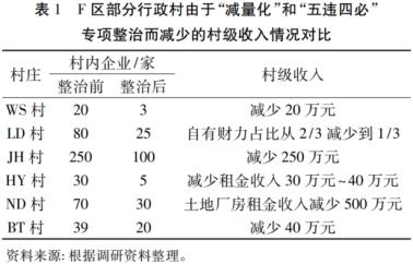 表1中的村庄是笔者在F区实地走访的一些村庄,“减量化”和“五违四必”对各村集体经济产生了很大的冲击。根据F区N镇的农经管理干部反映:“‘减量化’和‘五违四必’将农村集体建设用地减少了60%,目前只剩下40%。这一轮的‘减量化’和拆违对村集体经济打击很大,很多原来集体经济不错的村开始收支倒挂了,N镇还是好的,其他位置偏远的镇村日子更加难过”。在“减量化”和“五违四必”专项整治中,能够为集体经济创造收益的低效用地、违法用地和违章建筑往往会被拿来“先开刀”,“政府和村里为了完成任务,有时候没有办法,只能一个是先拆集体的,一个是先拆党员干部家里的违章,这样后面做起工作来也要硬气一点”。在F区,不少村庄都出现了“因拆致贫”的困境。表1所列的六个村庄,在“减量化”和“五违四必”整治之后,村内企业都大幅度减少,村级收入也下降明显。更为困难的现实是,拆违之后,村级刚性支出没有减少,反而因为绿地面积和环境卫生标准的提高而增加了开支压力。上海的其他郊区的农村集体经济也面临着类似困境。比如,据统计,2017、2018两年,嘉定区安亭镇拆除存量违章建筑392.67万平方米。“拆违对村级经济无疑是一次重创——全镇42个村中17个村戴上了‘经济欠发达村’的帽子”。根据另一则报道:“2015年10月以来,华漕镇共拆除违建322万平方米,实现土地‘减量化’1856亩,关停并转‘三高一低’企业850家,在城乡面貌发生翻天覆地变化的同时,‘关’和‘拆’也给农村集体经济带来阵痛。比如纪王村,2016年农村集体经济收入近2086万元,到2017年仅为941万元,减少55%”。