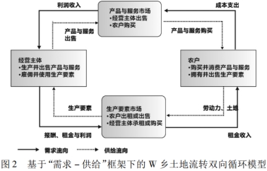 在“需求—供给”的理论框架下,W乡的农村土地流转构成了一种闭合的双向循环模型(如图2所示),即:一方面农户为市场或经营主体供给劳动力和土地,通过劳动报酬和土地租金等收入购买市场或经营主体的产品和服务,从而满足自身物质生活和精神生活的需要;另一方面经营主体通过市场雇佣农村剩余劳动力、租赁农户土地等生产要素,支付农户和市场报酬、租金,并通过出售产品和服务获得利润收入,扩大经济规模以及产品与服务的质量,进而实现对流转土地的可持续性运营管理。通过股份合作经营流转、土地承包经营权换社保、集体建设用地直接入市等土地流转方式,经营主体将W乡流转的土地用于种植农副产品、花卉和优质造林苗木,形成了集种植、加工、销售为一体的产业链,并深入挖掘本土特色自然、文化资源,发展乡村休闲农业、乡村观光旅游和乡村民俗体验等产业。实践证明,在“需求—供给”的理论框架下,W乡土地流转的复合型模式作为乡村振兴战略顶层设计的应有之义,不但实现了农村土地流转的可持续性发展,还构建了一种在新时代乡村振兴战略背景下农户、市场与经营主体三者互惠共生的发展格局。