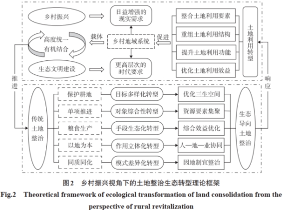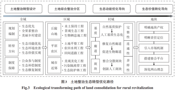 土地整治作为助推乡村振兴的重要抓手,应结合区域自然基底条件并与土地利用转型阶段相适应,按照因地制宜原则,运用更多生态化手段,合理配置农村土地和产业等关键要素,积极推进传统土地整治向以生态为导向的土地整治转型(图3)。