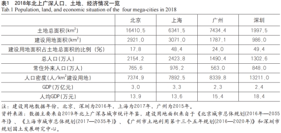 表1展示了北上广深的人口、用地情况。从中可以发现4个城市的平均人口密度都很高,其中深圳土地面积最小,人口密度最高。土地资源方面,上海和深圳的建设用地占土地总面积的比例较大,接近50.0%;北京和广州的建设用地所占比例则相对较低。各个城市的土地资源储备和人地关系情况不同,导致土地利用的管控力度分异。尽管北京土地总面积在4个城市中最大,但山区面积占比高达62.0%,城乡建设用地仅为土地总面积的17.8%,因此北京市政府对于新增土地供应较为谨慎,同时对土地开发强度的管控也比较严格。