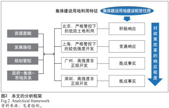 自2017年《试点方案》推出以来,北上广深利用集体土地建设租赁住房(下文简称为集租房)实施效果并不如预期理想。除了北京明确提出每年2km2的集体土地用作租赁住房建设的目标外,其他城市大多停留在零星项目开发阶段。那么,究竟是哪些因素决定了地方政府对政策改革的响应差异呢?结合各城市政策制度环境等背景分析,可以发现集体土地利用模式与各城市不同的资源条件、历史发展路径等密切相关。为此,笔者建立一个四维度的分析框架——从“资源禀赋、发展路径、规划管控、政府—集体—市场关系”来探讨不同城市对试点政策的响应差异(图2)。