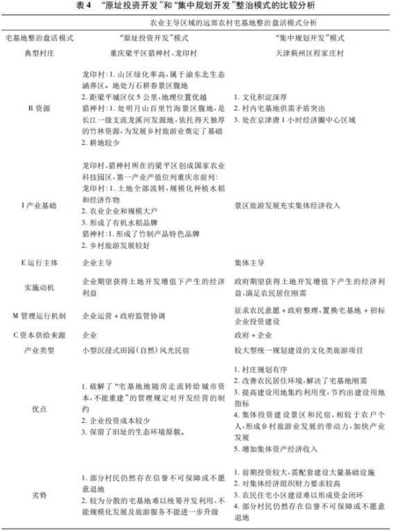 资本供给和管理机制方面,“原址投资开发”模式依托市场机制,由企业具体出资开发运营,由企业负责出资在原址上重建民宿和补偿退地退房的农民,基层政府监管协调,村民获得退地补偿或流转租金或入股分红。“集中规划开发”模式则依靠集体本身的经济实力和发展思路,需要在集体内部形成可持续的经营收入来源,并且有明确的产业发展规划,同时还要有集体带动发展。