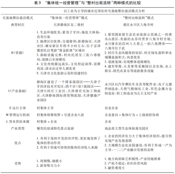在资本供给、管理机制方面,两种模式都依赖城市资本、企业资金,但是管理机制有所不同。“集体经营性建设用地入市打通”模式走的是“事前整治”,依靠集体规划设计,将闲置宅基地复垦,通过村内增减挂钩的“漂移”后入市,形成集体资产收益。农民可以获得退出收益和入市收益。“整村出租流转”走的是“事后整治”,集体只负责协调企业和农民之间的土地流转,宅基地整治和产业用地供给由承租的企业自主完成,企业整治获批的难度较大,而且农民仅获得土地流转收入和退出补偿。