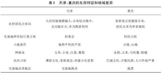 天津和重庆作为两个直辖市,是第二轮宅点制度改革试点省份,在第一轮宅基地制度改革中分别创新推出了“宅基地换房”和“地票”做法,具有一定的代表性和典型性。对本轮试点的全国性调研中发现,这两个直辖市在盘活利用农村闲置宅基地和住宅发展乡村产业中做了积极探索,同时,由于农村居民点布局、宅基地所有权行使主体、土地条件、种植业、民风习俗均有明显的东西特征和地域差异(见表1),在农村闲置宅基地退出方式、盘活利用方式、经营方式和产业类型方面有明显差异,且带有明显的区域性特征。