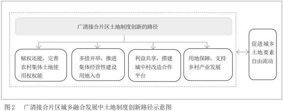 深化城乡要素市场化改革的关键在于土地要素。在国家城乡融合发展试验区中,需着眼于土地制度这一重点领域,力争率先破除陈规和难题。广清接合片区从多个层面进行了土地制度改革创新,探索城乡融合发展的实现路径(图2)。