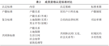 上述司法审理中的“复合标准”,实际是在宽泛的“户籍标准”与严苛的“共同体标准”之间的折中妥协,考虑了当代农村社会中人员流动、户口与居住地不一致等情况。“复合标准”以户籍为外观,以农民生存生活的社会保障(土地承包权、收入来源)为实质,并遵循男女平等的基本原则(见表2)。显然,尽管具有户籍,类似“外嫁女”“招夫女”“入赘男”等仍难以在乡土社会实践中被承认符合“共同体标准”,但按照相关法律法规却被司法审理所认可。