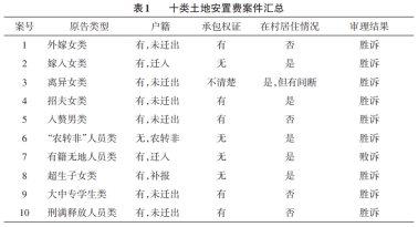 上述十类土地安置费案件,依据原告类型、户籍、承包权证、在村居住情况、审理结果等,可汇总梳理如下(见表1)。