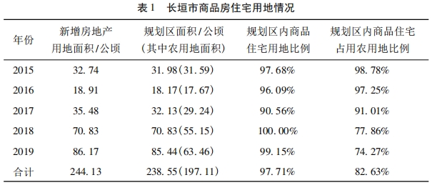 以长垣为例,2015—2019年,共出让商品住宅用地244.13公顷。从区位看,主要集中在城市规划区范围内,共计238.55公顷,占房地产用地总量的97.7%。其中,城市规划区内的商品住宅用地82.63%来源于农用地(见表1),这些农用地都位于规划建设区内,在征收农用地时,其周边道路、零星经营性建设用地、公益性公共设施用地和未利用地也一同被征收。