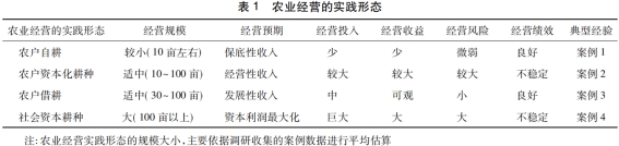 在结合农业经营实践形态描述的基础上,本文通过以上分析进行归纳(见表2)。