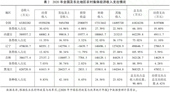 4.经营性投入资金数量过少,后续发展能力不足。(见表3)2020年全国农村集体经济的总支出中“经营支出”占比为19.60%,内蒙古、辽宁、吉林和黑龙江的占比分别为11.10%、5.59%、4.28%和8.42%,四省区平均水平不足全国的一半。主要原因是村集体经济收入普遍较少,节余资金过少,甚至一些村还存在负债。因为缺少资金很难开展经济活动,又导致缺项目、缺产业,直接影响村集体经济的后续发展能力。