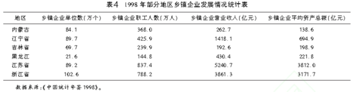 4.缺少商品化过程的洗礼,农民商品化市场化意识较低。东北的农村商品经济发展滞后,特别是黑龙江省和吉林省,农村商品化、市场化的进度没有跟上全国的步伐。上世纪80、90年代我国乡镇企业蓬勃发展,东北在那个历史阶段乡镇企业发展就较为滞后。以黑龙江省为例(见表4),1998年黑龙江省乡镇企业总量21.6万个,仅是占江苏的24%、浙江的21%。乡镇企业的经济效益更差,1998年东北地区乡镇企业营业收入合计仅占江苏省的44%,尤其是内蒙古和吉林省的乡镇企业营业收入极低,每个企业营业收入平均仅为3万元左右。因乡村缺少商品化市场化过程的洗礼,到现在农民的商品意识和参与市场竞争的能力也很低,主要以粮食种植业为主,收获的粮食绝大多数直接卖给粮库。这是商品化程度最低的一种生产经营方式。农民商品化、市场化意识低,导致地区乡村产业不发达,产业结构单一。