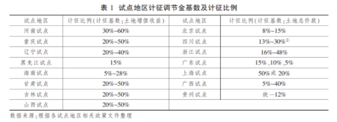 事实上,试点地区计征调节金遵循的原则较为一致,即在其他条件相同情况下,入市土地收益越高,调节金计征比例也越高。一般来说,在其他条件相同的情况下,对商服用地征收调节金的比例高于对工业用地的计征比例,规划区内计征比例高于规划区外计征比例。如浙江试点以入市土地成交总价款为基数计征调节金,入市地块位于县城规划区的,试点县政府对商服类用地、工矿仓储类用地分别计征48%、24%的调节金;入市土地位于乡镇规划区的,试点县政府对商服类用地、工矿仓储类用地分别计征40%、20%的调节金;入市土地位于其他地块的,试点县政府对商服类用地、工矿仓储类用地分别计征32%、16%的调节金。