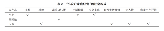 以上描述可以发现,在农民的日常生活中,小麦和玉米并不仅仅是农业经济知识体系中的农产品,而是对于自己的日常生活具有丰富社会意义的社会构成之物。农民对待耕种收获物和收入性货币的日常处置,勾勒出如表2所示的“小农户家庭经营”的社会构成,即“小农户家庭经营”在农民社会生活中所扮演的结构性角色。