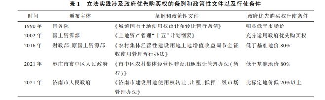 《城镇国有土地使用权出让和转让暂行条例》第26条的立法规定,是我国土地政府优先购买权的主要条款;2002年国土资源部《关于印发〈土地资产管理“十五”计划纲要〉的通知》提出“建立土地交易价格申报制度,充分运用政府优先购买权”,该通知并没有区分国有建设用地和集体建设用地,集体经营性建设用地的国家优先购买权自此正式确立。近十年来,政府优先购买权的立法相对停滞,立法层级不高,以“条例”“办法”等条例和政策性文件体现出来(表1)。自政府优先购买权确立以来,这项制度的优势并未得到充分有效的发挥,实践中政府行使优先购买权干预土地市场的案例较少。2015年2月以来,国家在33个试点地区开展“三块地”即农村承包地、宅基地和集体经营性建设用地制度改革,试点地区的“政府主导模式”表明,集体经营性建设用地入市中的政府优先购买权进入实践阶段