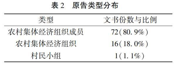样本案例的诉讼原告有三种类型,典型的有拟确认的农村集体经济组织成员,此外还有村民小组、农村集体经济组织(具体分布见表2)。说明农村集体经济组织成员资格的认定不仅是个人权利的基础,对集体亦具有法权范围确认的意义。