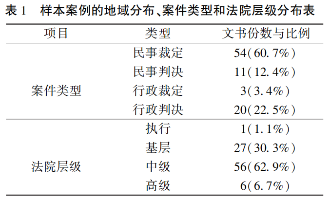 笔者的司法判例考察样本取自于《中国裁判文书网》,以“农村集体经济组织成员资格”为关键词,时间为2021年1月1日至2021年12月31日,不限制文书类型和案件类型,共检索到89份有关农村集体经济组织成员资格的诉讼样本案例。样本选择的期间是《民法典》实施以来的一年,可以同时作为法典相关内容施行效果的参考。案例在主要行政区域、案件类型和法院层级上均有所分布(见表1),具备统计学上的意义。