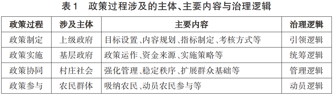本文的政策过程主要是指自上而下、具有公共治理导向的政策过程,包括“政策制定”“政策实施”“政策协同”“政策参与”四个层面,构成完整且中观的运作过程。其一,政策制定是政策过程的起点,涉及政策制定者对公共政策目标、指标与考核等具体内容的设定,是从指导意义上对政策过程的规划,其承担主体一般是具有权威性的党委政府,遵循的是引领逻辑。其二,政策实施是政策过程的中间环节,涉及政策如何进行中期统筹,如对政策运作、资金来源、实施策略等具体问题的处理。政策实施强调统筹和执行能力,是影响政策能否落地的重要环节,其承担主体多为肩负属地责任的基层政府,遵循的是统筹逻辑。其三,政策协同是政策过程的动力机制,能够在科层体制自上而下的动员基础上补充社会管理形式,其目的是强化管理、稳定秩序以及扩展群众基础等,是政策落地的基层对接过程。其治理主体内生于村庄社会,遵循的是对基层社会的管理逻辑。其四,政策参与是政策过程的落地环节,是政策在乡村社会与最基本的行动单元的碰撞,也是决定政策意图能否实现的关键。其主要内容是促使农民配合以实现政策效果,达到改造基层的目的,涉及主体是农民群体,体现了政策过程的动员逻辑。政策过程不同环节涉及的主体、主要内容与治理逻辑见表1。