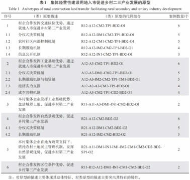 本文从20个案例中提取了6个原型。这些原型揭示了入市的制度安排与地方条件构成的6种因素组合,也展现了入市促进乡村第二或第三产业发展的不同路径(表1)。原型之间的比较分析则揭示各种因素组合的共性与差异,从而印证入市促进乡村二三产业发展的机理。