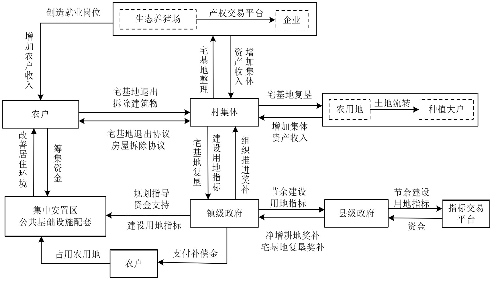 在宅基地退出过程中,省、市地方政府是制度环境的供给者,其主要作用表现在为省内跨市交易节余建设用地指标、耕地占补平衡指标和保障集中安置区用地等提供政策支持。省、市政府根据城乡建设用地增减挂钩政策和耕地总量动态平衡政策,将县域内宅基地退出整理复垦后的节余建设用地指标、土地整治新增耕地指标纳入省级土地指标交易平台进行跨地市交易,扩大交易范围,显化土地级差收益,使县级政府获得更多的土地指标交易收益,为宅基地退出的资金保障提供政策支持。此外,宅基地退出后集中安置区的选址落地和用地性质变更都涉及国土空间规划的调整,需要省、市地方政府审批和调整规划,以解决用地来源,保障集中安置区的落地建设。