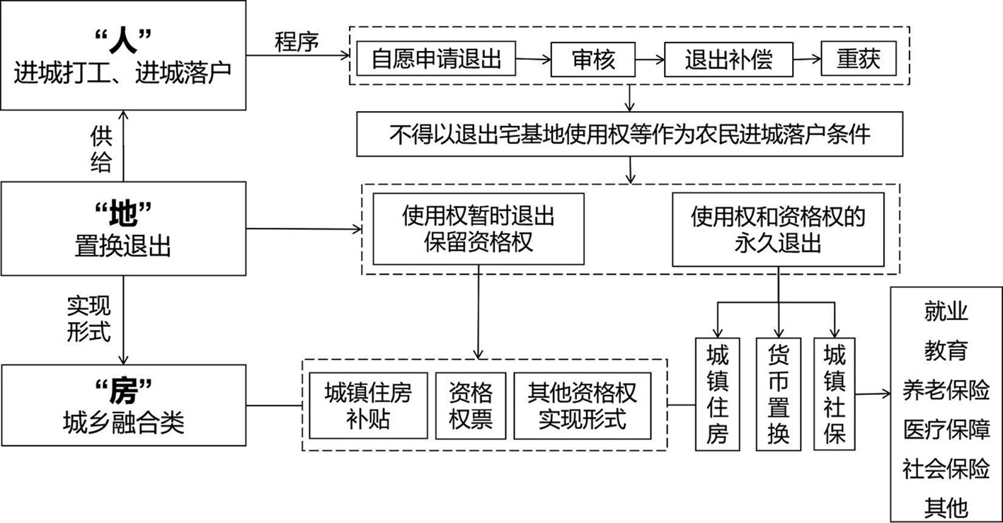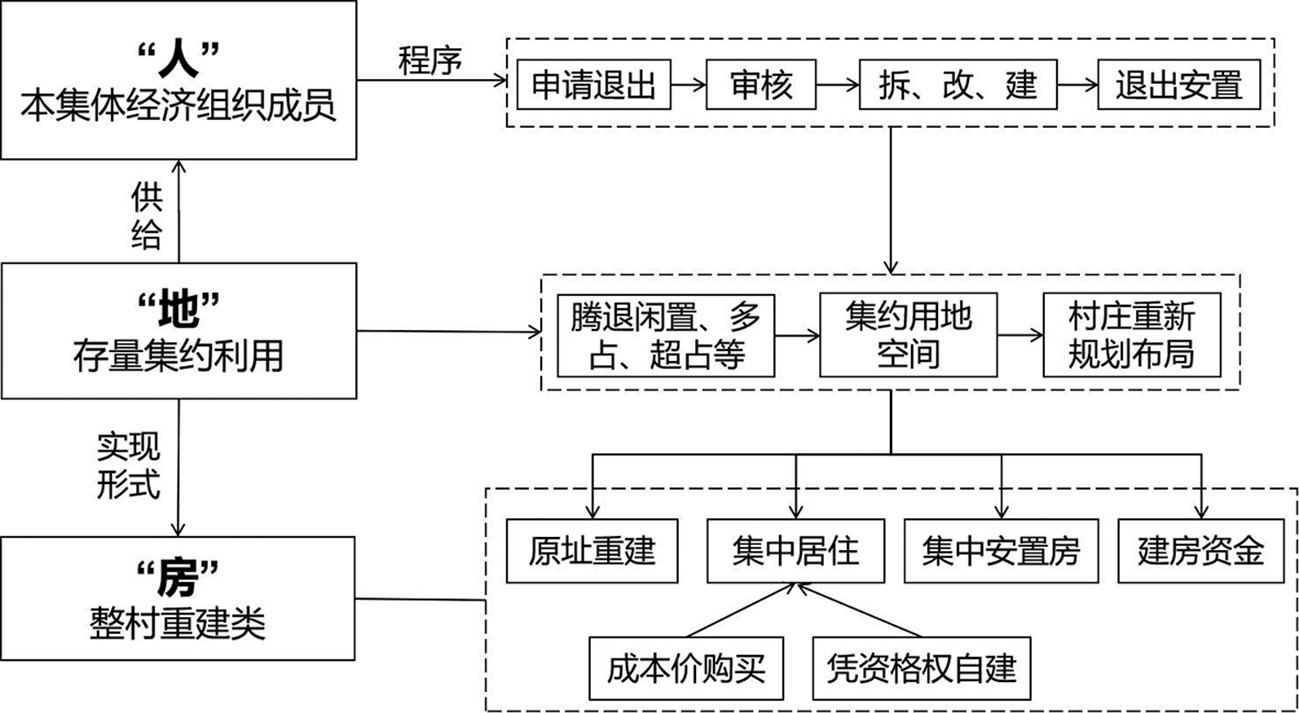 基于农民城镇化、宅基地闲置与刚需并存的事实,以尊重农民意愿为前提,联动宅基地使用权流转制度、宅基地自愿有偿退出机制和审批监管制度,通过存量宅基地集约高效利用保障土地供给和多样化的住房供给形式,实现土地和住房供给。
