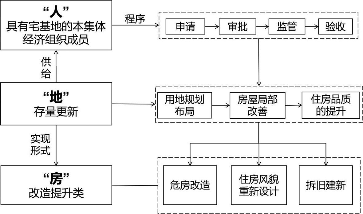 “存量更新”是指通过对现有宅基地(房屋)进行改造更新,对住房风貌和周边基础设施进行改善提升,以优化村庄用地布局、提升农民居住质量的过程。“改造提升类”住房保障是指在“存量更新”的供地模式下不对现有宅基地(住房)布局进行大幅度改动,更多地指向“住房功能”的改善提升(见图2)。但参与改造的前提是:参与改造的农户具有住房保障福利资格;农户对住房质量改善的意愿较高;农户具有更高层次的居住需求等。