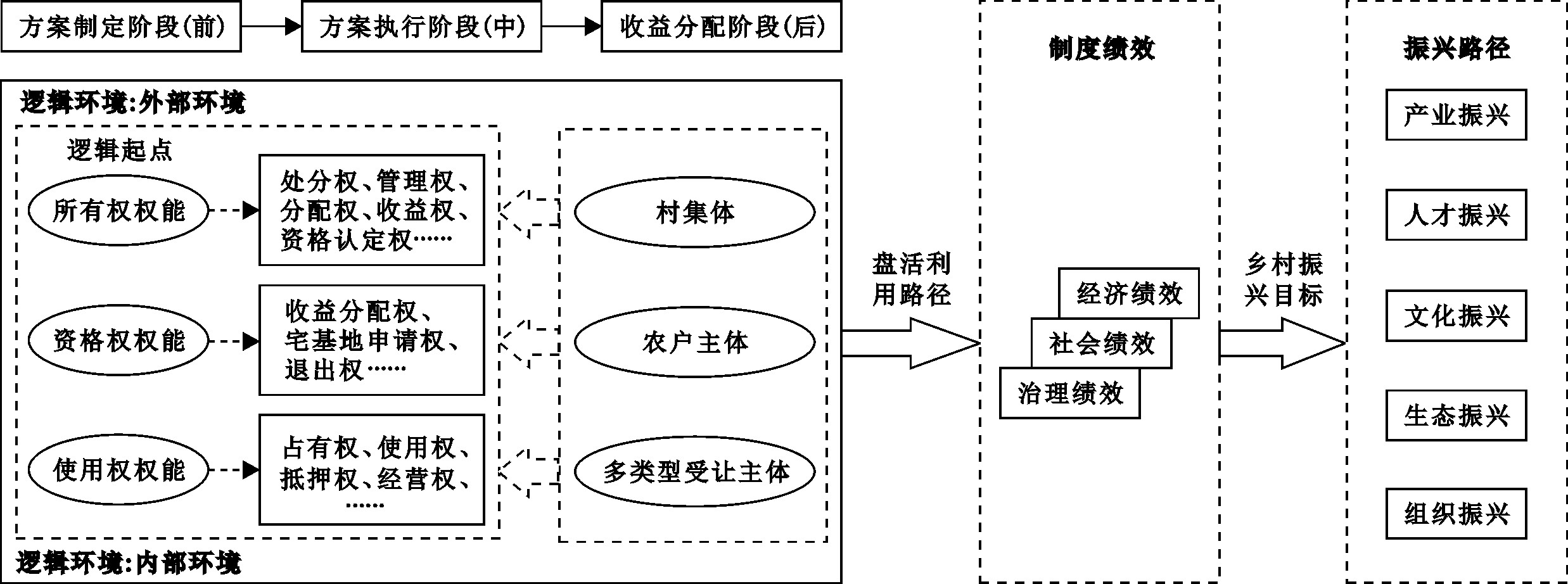 制度决定论从制度的内生性层面出发,认为制度在联结个体与社会的行为与互动时会形成决定性作用。农村宅基地“三权分置”的制度设计基于产权清晰、逻辑自洽的理论推演而成,农村集体、农民个人及社会主体间形成三权兼顾的清晰配置格局。不同主体发挥主体能动性并塑造出特定的赋权形态,相互依赖、成为引发彼此的原因或结果,实现宅基地盘活利用过程中“三权分置”的整体效能。与此同时,赋权理论同时关注过程与结果,并基于内外部环境情境形成赋权链条。在宅基地盘活利用过程中,具体分为方案设计、方案执行和收益分配的前后动态过程关系,同时嵌入农村社会结构后,形成“经济-社会-治理”的制度绩效。基于此,本文从内外生融合性及乡村振兴路径实现的视角,构建起农村宅基地盘活利用赋权实践的综合理论分析框架(见图1)。
