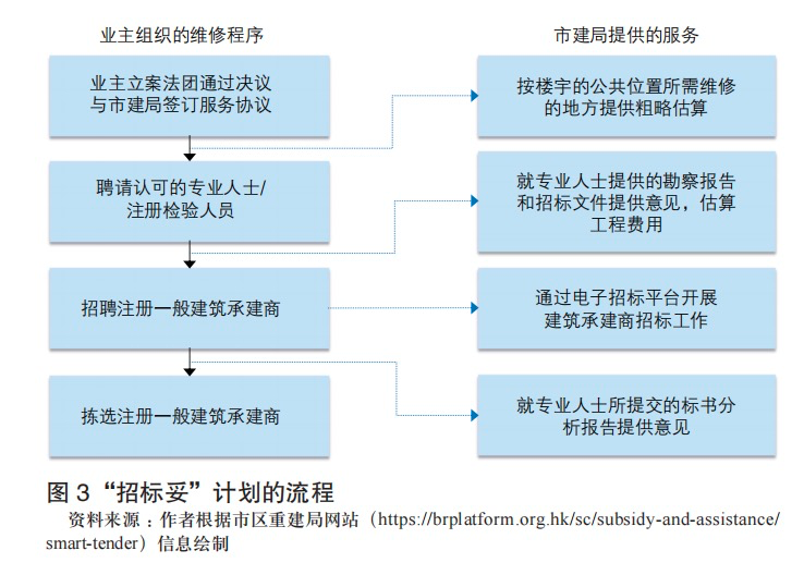 一方面,特区政府通过政策施压,驱动市建局实施复修重设策略。通过《市区重建策略》等政策文件赋予市建局复修重设等职责,并通过前文所述的人事任命、预算审批权以及述职要求等,确保市建局实现政府愿景。在此驱动下,市建局推出“招标妥”计划、楼宇维修综合支援计划等一系列资助计划,帮助业主开展楼宇复修。