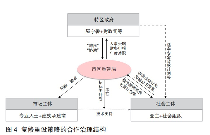 总而言之,复修重设策略主要由特区政府通过“施压”与“协助”驱动市建局实现委托人目标,而市建局也基于代理人的经济理性,通过联结市场主体和社会主体,形成了以促进自主更新为主要目标的合作治理结构(图4)。