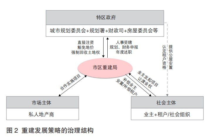总之,基于委托—代理关系,代理人市建局在追求自身利益目标的同时,也实现了委托人香港政府的利益目标。重建发展策略以市建局为核心,形成了政府、市场和社会主体之间稳定的治理结构(图2)。