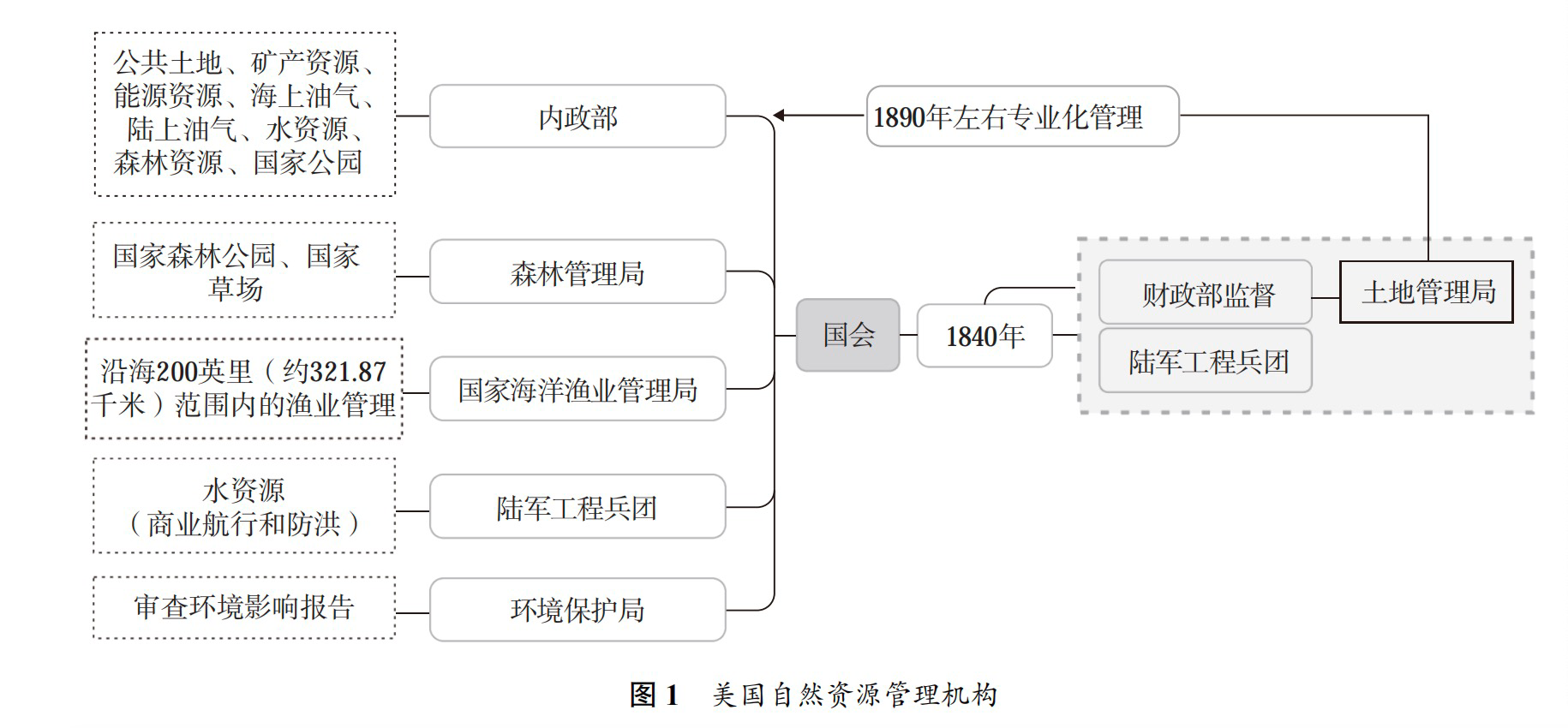 随着美国联邦政府对自然资源管理的强化,相应的管理机构也逐渐增多。美国联邦政府对自然资源的管理归属于公共事务管理,主要负责土地测量和处置。在具体职责分工方面,国会委派测量人员联合财政部共同监督土地售卖,由陆军部负责监督军用土地使用证的发放。然而,这种非系统的管理方式无法适应快速发展的公共土地业务,于是国会开始在财政部内部建立独立的土地管理局。1849年,国会成立了内政部,直接管理土地管理局,同时负责管理公共公园和西部地区开发,以确保自然资源管理科学化,实现自然资源最佳利用。但直至1879年,内政部未能充分重视公共土地的自然资源管理。随后,有学者向国会提交报告,主张对自然资源实行专业化科学管理。1880年,国会授权某一委员会对公共土地进行调查,在形成的报告中建议:要对公共土地进行调查登记,按土地最佳用途进行分类,并针对每种土地类型制定相应的管理政策。直至1890年,美国才充分意识到,对重要的自然资源实行公有制和科学管理,方能最大程度地实现资源的最佳利用。