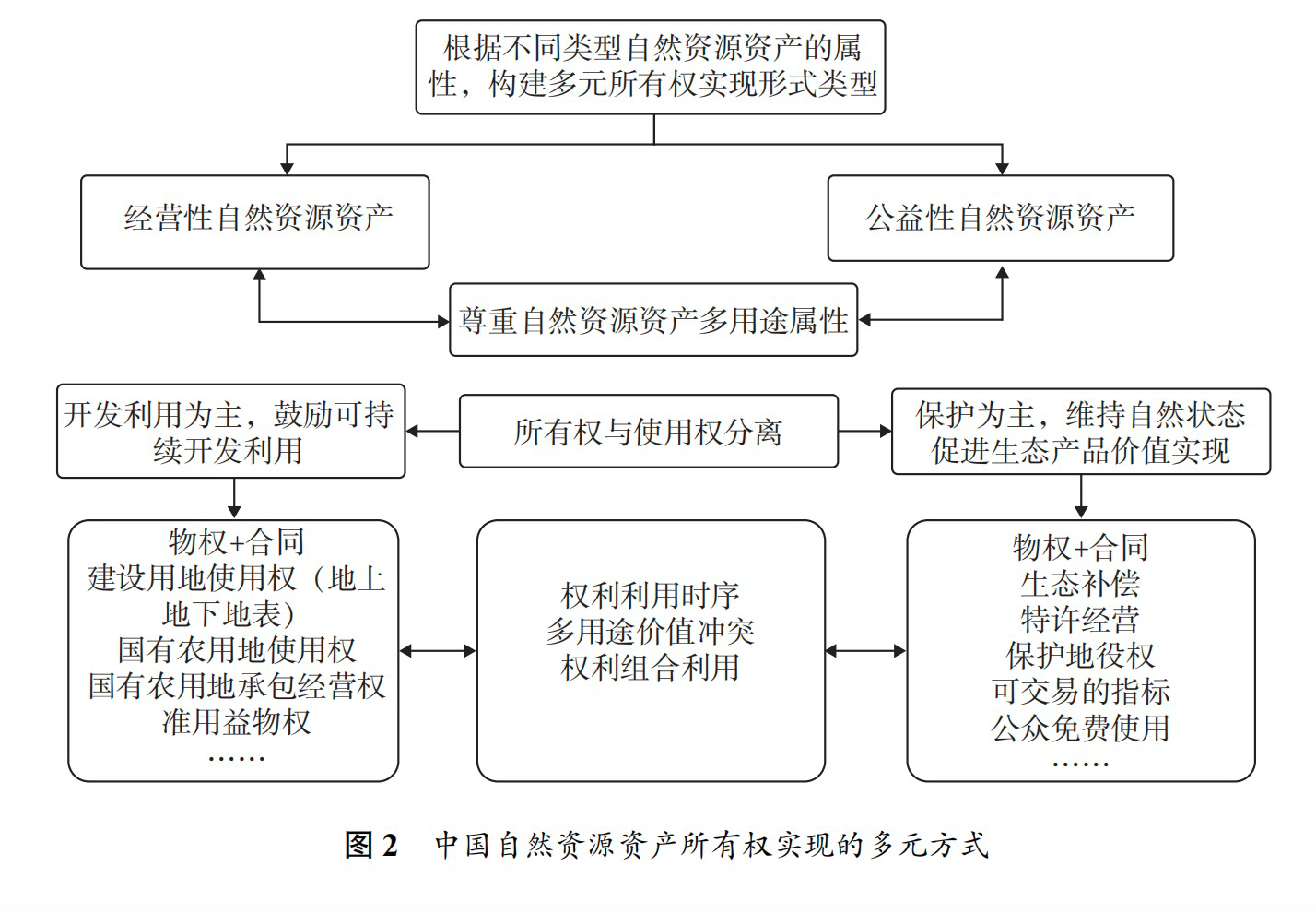 中国应进一步加强对自然资源资产属性的认识,尊重不同类型资源属性,构建多元化所有权实现形式类型。马克思主义认为,人靠自然界生活,人类在同自然的互动中生活、生产、发展。中国作为社会主义国家,不同的自然资源资产对人民和国家来说具有不同的意义。当前,中国在管理中主要将自然资源资产分为公益性和经营性两大类:公益性以保护为目的,经营性鼓励市场主体在保护的前提下通过有偿使用的方式进行开发利用。然而,这两大类分类方式尚不足以完全满足管理需求。自然资源资产的外部性和公共性特征使其不同于其他物品,即使成为商品,也与汽车、房屋等财产有所区别,对自然资源资产的处分行为可能影响所有者以外的其他人,包括未来世代的主体。这也是自然资源资产中的产权争议不断并且会发生变化的原因。因此,有必要采取更加精细化的动态分类、适用性管理,建立中国自然资源资产所有权实现的多元方式,如图2所示。