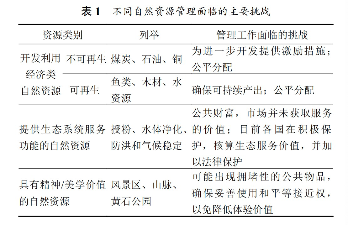 为了提高自然资源的利用效率,美国按照自然资源的属性对其进行了类型化归纳,明确了各类资源的内容指向和管理重点,不同自然资源管理面临的主要挑战,如表1所示。