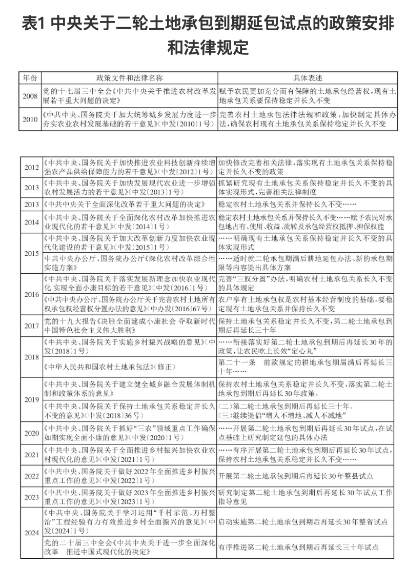 党的十七届三中全会明确提出“赋予农民更加充分而有保障的土地承包经营权,现有土地承包关系要保持稳定并长久不变”,目的就是要更好地稳定农民对土地经营的预期,长期保护农民土地承包权益。自2008年以来,中央连续发布多个中央一号文件对延包试点工作作出详细部署(见表1)。