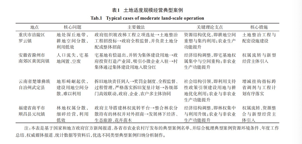 土地适度规模经营包括以平整土地、设施改善为目标的土地整治路径和以优化农村土地权属为基础的土地流转路径,在实践中具体呈现为以土地平整、梯田建设为特征的土地整治工程,以资格权有偿退出、使用权流转为特征的宅基地“三权分置”,和以稳定承包权、流转经营权为特征的农用地“三权分置”三类措施。如重庆市涪陵区罗云镇以资源结构转型为抓手,采取土地整治工程与配套设施建设措施,开展了规模化“坡改梯”工程,推进“小田变大田”及现代化管理,实现了土地资源的数量增加、质量提升、空间结构优化;安徽省滁州市南谯区黄泥岗镇以经济结构转型为切入点,采取权属流转与新型经营主体引入措施,对闲置空废宅基地采取有偿退出、置换、租用方式开发餐厅、民俗馆,突破生产资料占有分配与利用关系难题,服务乡村旅游产业发展,实现产业结构优化升级;云南省楚雄彝族自治州武定县着力激发社会主体力量,通过政府牵头和多元主体参与的方式高效落实跨省增减挂钩指标调剂任务,为农业提质、产业升级奠定规模化空间基础;福建省南平市顺昌县元坑镇以经济结构转型为核心,通过从林农手中流转林地使用权,进而整合为“林权资源包”对外招商,实现经济结构的生产资料优配、生产主体升级、产业结构多样化转型,推进林地现代化经营(表1)。