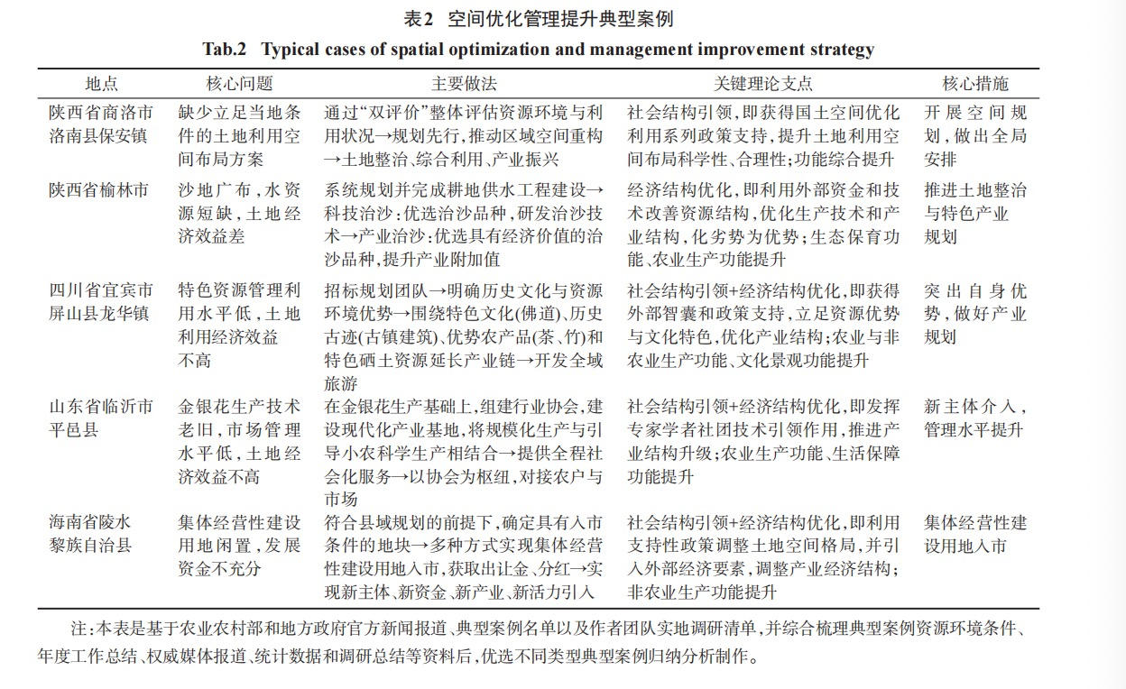 空间优化管理提升包括以双评价为基础的国土空间规划路径、以补足短板和配套设施为特征的工程规划路径、以特色挖掘为特征的产业规划路径、以管理优化为特征的组织规划路径,在实践中具体呈现为“双评价”与国土空间规划、土地工程与生产设施配套、基于区域特色的系统产业规划、新型主体引入与管理优化等措施。如陕西省商洛市洛南县保安镇以社会结构为抓手,坚持国土空间规划基础性、统领性作用,通过对全镇土地做出统筹规划、政策引领与全局安排来推动产业振兴与结构重塑;陕西省榆林市聚焦经济结构优化,综合采取沙化土地整治与沙地资源开发措施“以产促整”,优化生产要素匹配结构,并以农为根,延长产业链,实现产业结构的升级;四川省宜宾市屏山县以社会结构引领为切入点,发挥新社会主体智力支撑作用,以特色文化赋能经济发展,将硒土资源优势与历史文化资源优势相结合推进产业结构升级;山东省临沂市平邑县以社会结构的创新性调整为动力起点,组建金银花协会,引导药农科学生产,联接“小农户”和“大市场”,提升传统产业创新活力与发展效能;海南省陵水黎族自治县以经济结构调整为抓手,出台符合当地更高质量发展需求的政策法规与法律制度,通过集体经营性建设用地入市,释放资源、环境和区位潜力,为产业优化、居民增收、发展提质引入新主体、新资金、新产业、新活力(表2)。